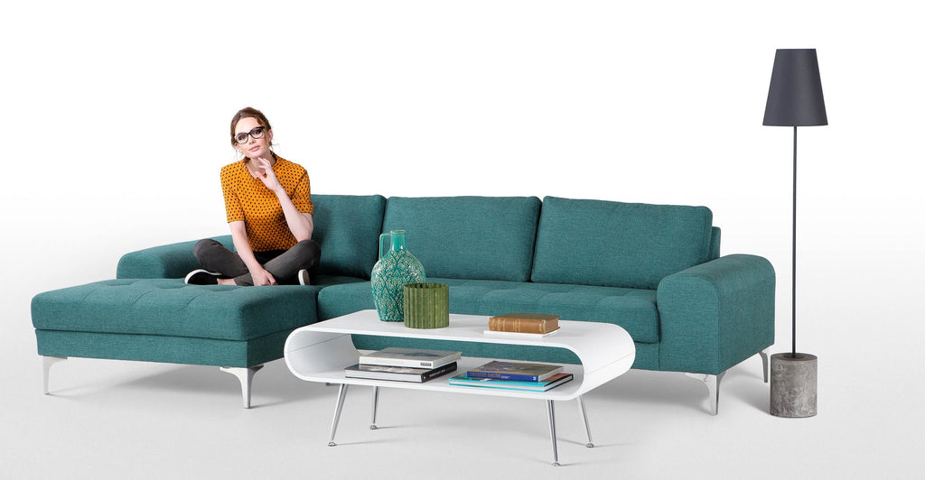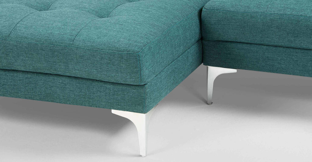 A high-impact pairing of contemporary design details with a cool, relaxed Italian style. In a rich teal shade. A striking contrast of textures and shapes with rounded arms, a deep pocketed seat and angular metal legs. A firm yet comfy sit. Snuggle up or stretch out - this corner set comfortably seats up to six people. You can even separate the pieces to suit your set-up.